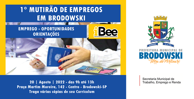 Ocorrerá no próximo Sábado (20/08) das 9h às 13h na Praça Martim Moreira, durante o Governo Itinerante e festividades da 47° Semana de Portinari, o 1° MUTIRÃO DO EMPREGO EM BRODOWSKI. O mutirão proporcionará a oferta de várias vagas de emprego, preparação para o do Mercado de Trabalho, orientação, confecção e impressão de currículos.