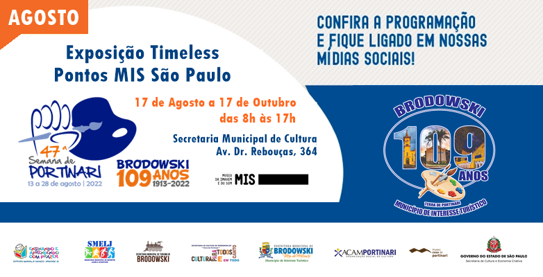 Com entrada gratuita, a exposição traz imagens do fotógrafo Marcelo Tinoco – revelado em 2012 pelo programa Nova Fotografia do Museu da Imagem e do Som. A partir de 17 de agosto, o município de Brodowski recebe a exposição Timeless, por meio do Pontos MIS, programa do Museu da Imagem e do Som (instituição da Secretaria de Cultura e Economia Criativa de São Paulo) para formação e difusão cultural no Estado. Com entrada gratuita, a mostra do fotógrafo Marcelo Tinoco poderá ser visitada, até 17 de outubro, na Secretaria Municipal de Cultura – Cine Clube Cândido Portinari.