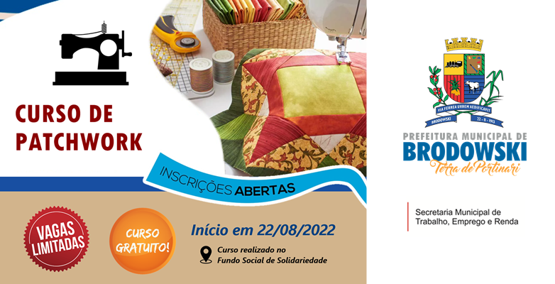 A Prefeitura do Município de Interesse Turístico de Brodowski, através do Fundo Social de Solidariedade e Secretaria Municipal de Trabalho, Emprego e Renda, abrem vagas para o CURSO DE PATCHWORK. O Curso acontecerá de 22/08 a 18/10/2022 na sede do Fundo Social de Solidariedade. O curso será totalmente GRATUITO e as vagas limitadas para pessoas de 18 anos e mais.