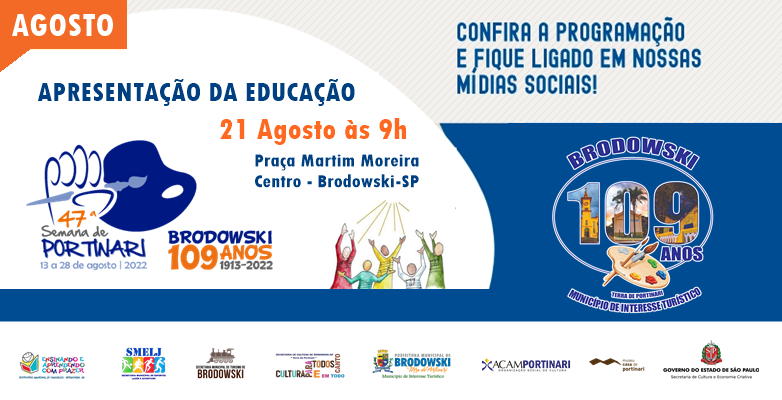 A Prefeitura do Município de Interesse Turístico de Brodowski, através da Secretaria Municipal de Educação com apoio cultural da ACAM Portinari e Museu Casa de Portinari apresentam nos festejos da 47° SEMANA DE PORTINARI a Apresentação da Educação.