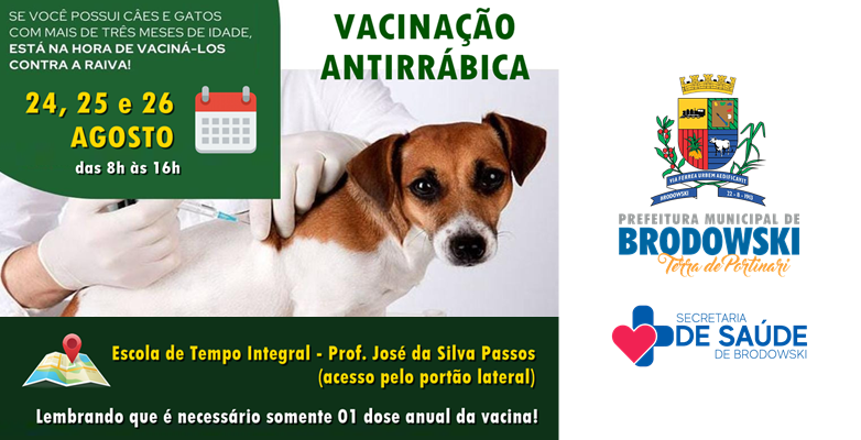 A Vigilância Sanitária e Controle de Vetores de Brodowski informam que realizarão nos dias 24, 25 e 26 de Agosto de 2022, mais uma etapa da vacinação antirrábica de cães e gatos a partir de 3 meses de idade.