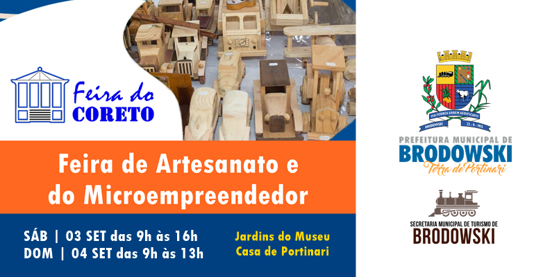 SÁBADO (03/09) e DOMINGO (04/09) ocorrerá mais uma edição da Feira do CORETO. O evento ocorrerá nos jardins do Museu Casa de Portinari.