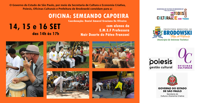 O Governo do Estado de São Paulo, por meio da Secretaria de Cultura e Economia Criativa, Poiesis, Oficinas Culturais e Prefeitura de Brodowski convidam para a: