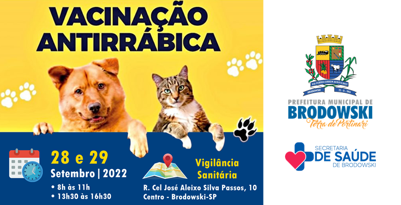 A Vigilância Sanitária e Controle de Vetores de Brodowski informam que realizarão nos dias 28 e 29 de Setembro de 2022, mais uma etapa da vacinação antirrábica de cães e gatos a partir de 3 meses de idade