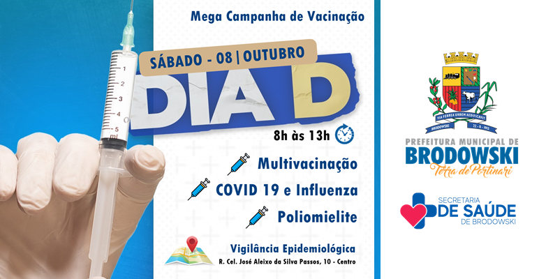 A Secretaria Municipal de Saúde, comunica que no próximo sábado (08/10) das 8h às 13h, ocorrerá a MEGA CAMPANHA DE VACINAÇÃO – “Dia D” na sede da Vigilância Epidemiológica.