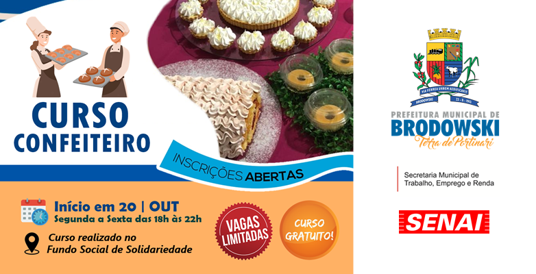A Prefeitura do Município de Interesse Turístico de Brodowski, através da Secretaria de Trabalho, Emprego e Renda em parceria com o SENAI, abrem Vagas para o Curso de Confeiteiro a realizar-se a partir do dia 20 de Outubro de 2022 no Fundo Social de Solidariedade. O curso será totalmente GRATUITO e as vagas limitadas para pessoas de 16 anos e mais!