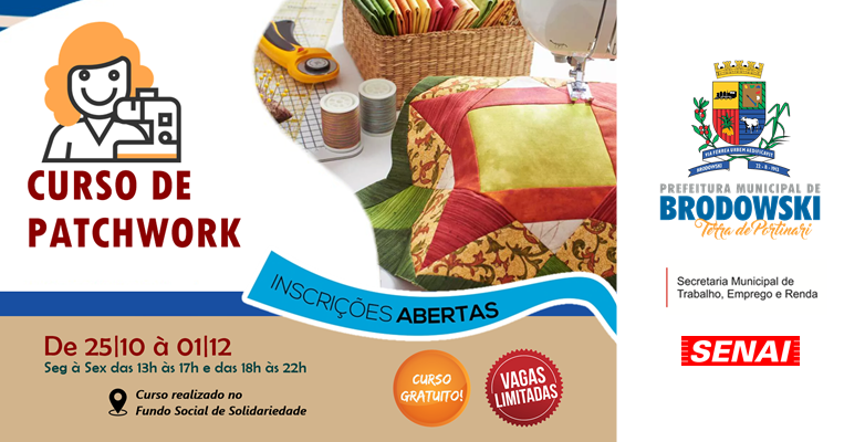 A Prefeitura do Município de Interesse Turístico de Brodowski, através da Secretaria de Trabalho, Emprego e Renda em parceria com o SENAI, abrem Vagas para o CURSO DE PATCHWORK, a realizar-se a de 25 de Outubro a 01 de Dezembro de 2022 no Fundo Social de Solidariedade. O curso será totalmente GRATUITO e as vagas limitadas para pessoas de 16 anos e mais e que já SAIBAM COSTURAR!