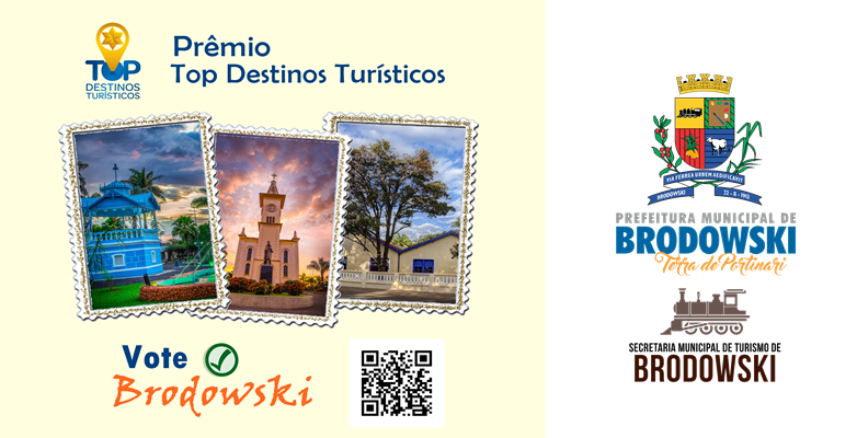 Vamos ajudar Brodowski a ganhar esse prêmio? Então, vote e chame seus amigos e familiares para eleger nosso município nas categorias “Turismo Cultural” e “Turismo de Aventura”, e para votar é necessário acessar o site https://votetop.com.br/voteagora, selecionar a categoria “TURISMO CULTURAL”, entrar em sua conta no Facebook, selecionar BRODOWSKI e confirmar sua escolha, o mesmo procedimento para votar na categoria “TURISMO DE AVENTURA”. A votação vai até 15/11/2022.
