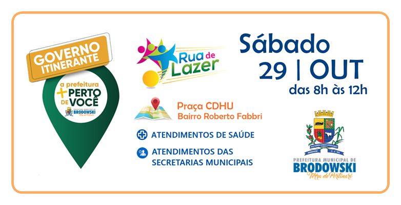 A Prefeitura do Município de Interesse Turístico de Brodowski em parceria com o Centro Universitário Claretiano de Batatais-SP, convidam a toda população brodowskiana a participar do próximo GOVERNO ITINERANTE e RUA DE LAZER. O evento ocorrerá no dia 29 de Outubro (sábado) das 8h às 12h na Praça do CDHU no Bairro Roberto Fabbri.