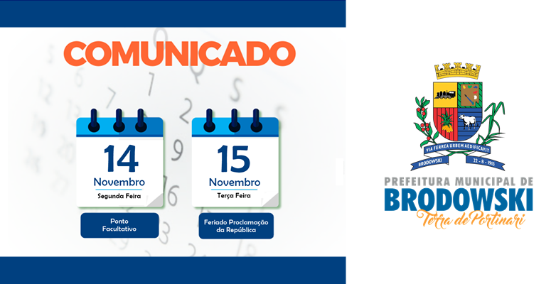 A Prefeitura do Município de Interesse Turístico de Brodowski informa que nos dias 14 e 15 de Novembro de 2022, NÃO haverá expediente nas repartições públicas do Município devido ao Ponto Facultativo e Feriado Nacional (Proclamação da República).