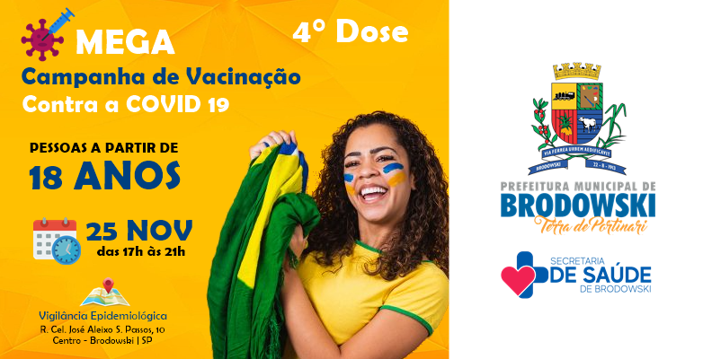 A Prefeitura do Município de Interesse Turístico de Brodowski, através da Secretaria Municipal de Saúde, realizarão na próxima sexta-feira feira (25/11) a CAMPANHA DE VACINAÇÃO CONTRA A COVID 19 – 4° DOSE E COM DIREITO A HORÁRIO ESPECIAL.