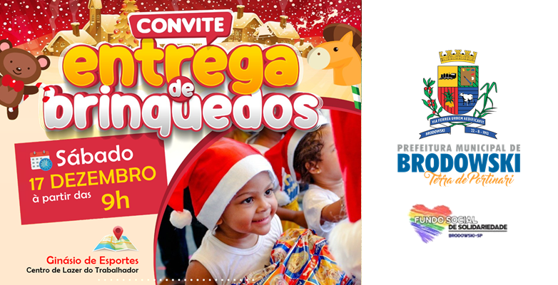 A Prefeitura do Município de Interesse Turístico de Brodowski, através da Secretaria de Desenvolvimento Social em união com o Fundo Social de Solidariedade, Secretaria de Cultura e Secretaria de Turismo convidam a todas as crianças de Brodowski para a Entrega de Brinquedos no Ginásio de Esportes do Centro de Lazer do Trabalhador!