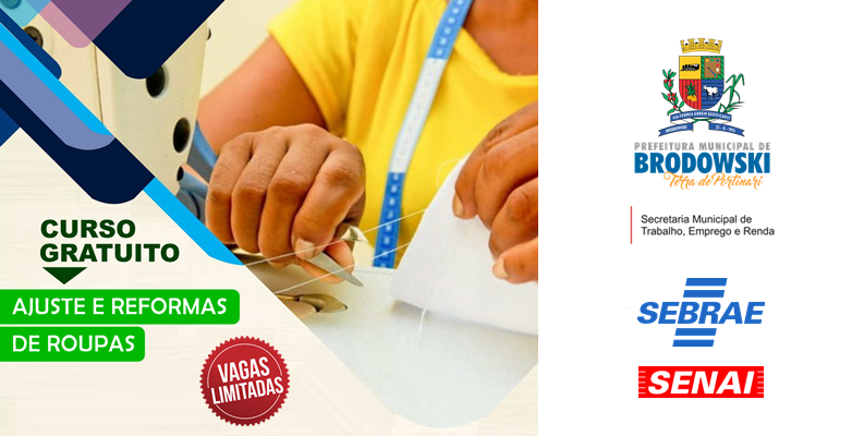 A Prefeitura do Município de Interesse Turístico de Brodowski, através da Secretaria de Trabalho, Emprego e Renda em parceria com o SENAI e SEBRAE, abrem Vagas para o Curso de Ajuste e Reforma de Roupas! a realizar-se a partir do dia 23 de Fevereiro de 2023. O curso será totalmente GRATUITO e as vagas limitadas para pessoas de 18 anos e mais!