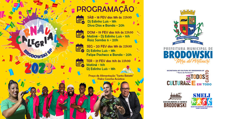 A Prefeitura do Município de Interesse Turístico de Brodowski, através da Secretaria Municipal de Cultura em parceria com a Secretaria de Turismo e Secretaria de Esportes, Lazer e Juventude, apresentam o CARNAVAL ALEGRIA 2023!