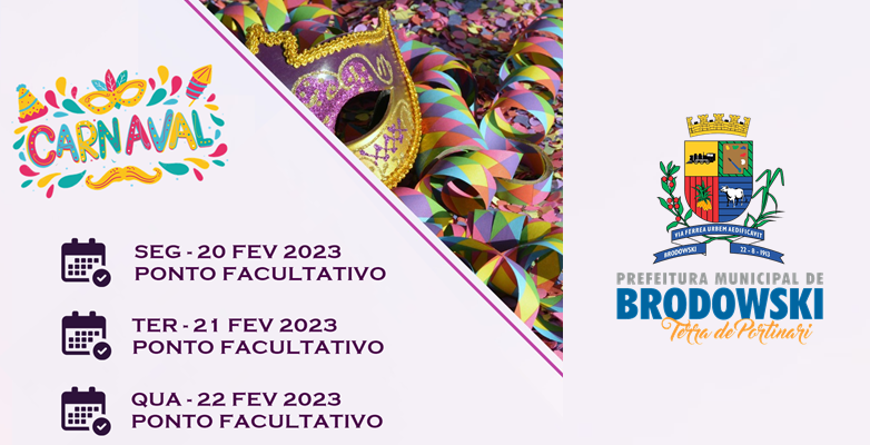 A Prefeitura do Município de Interesse Turístico de Brodowski informa que nos dias 20, 21 e 22 de Fevereiro de 2023, NÃO haverá expediente nas repartições públicas do Município devido aos pontos facultativos e de Carnaval.