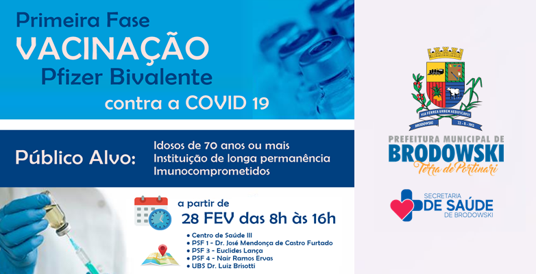 A Prefeitura do Município de Interesse Turístico de Brodowski, através da Secretaria Municipal de Saúde, comunica a partir do dia 28 de Fevereiro, já está liberado a Primeira Fase da Vacinação Pfizer Bivalente contra a COVID 19.