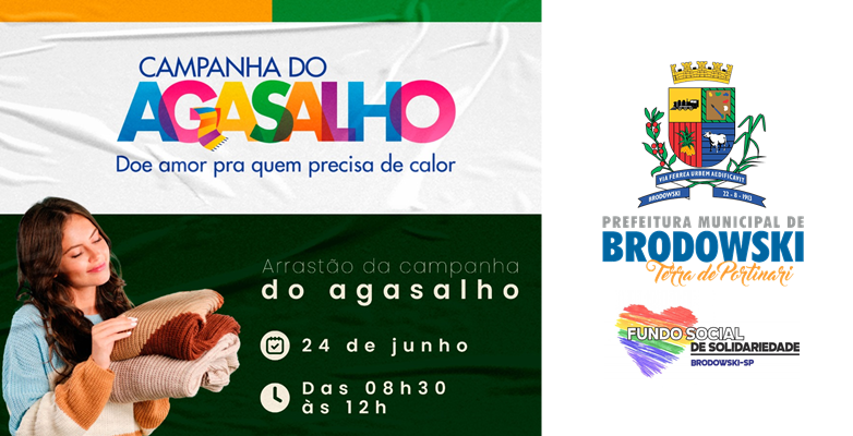 O Fundo Social de Solidariedade de Brodowski, INFORMA que no próximo SÁBADO (24/06), a partir das 8h30 às 12h, ocorrerá o ARRASTÃO da Campanha do Agasalho.