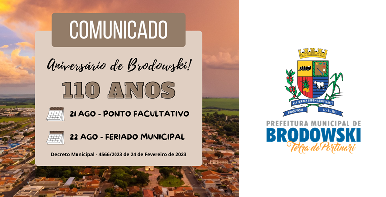 A Prefeitura do Município de Interesse Turístico de Brodowski informa que na próxima segunda e terça (dias 21 e 22 de AGOSTO de 2023), NÃO ocorrerá expediente nas repartições públicas do Município devido ao Ponto Facultativo e Feriado Municipal em decorrência ao ANIVERSÁRIO DE BRODOWSKI (110 ANOS).