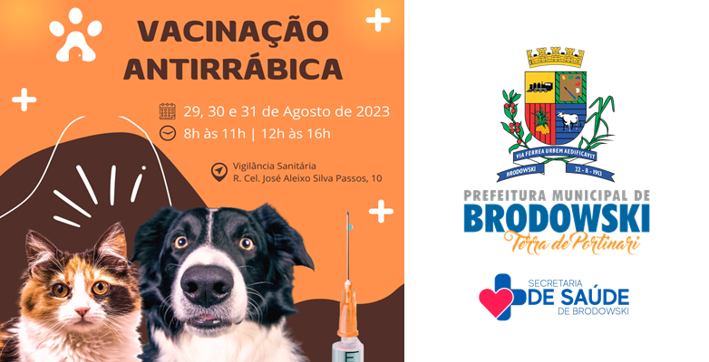 A Vigilância Sanitária e Controle de Vetores de Brodowski informam que realizarão nos dias 29, 30 e 31 de Agosto de 2023 (ou até durarem as doses), mais uma etapa da vacinação antirrábica de cães e gatos a partir de 3 meses de idade.