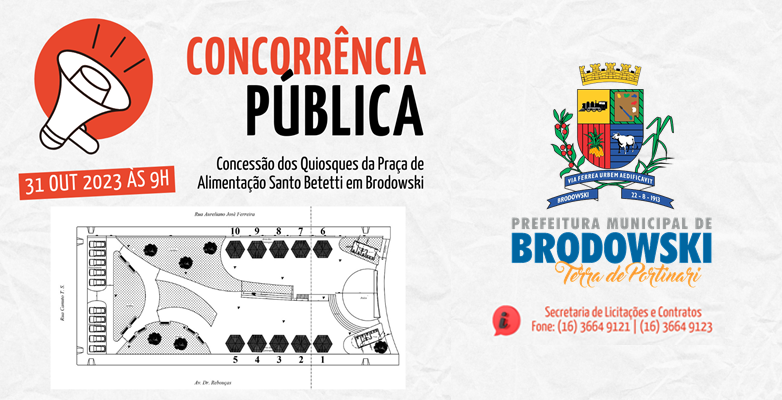 A Prefeitura Municipal de Brodowski anuncia a realização de Concorrência Pública para a Concessão dos Quiosques da Praça de Alimentação Santo Betetti em Brodowski.