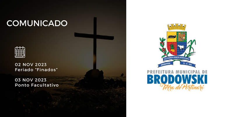 A Prefeitura do Município de Interesse Turístico de Brodowski informa que na próxima quinta e sexta feira (dias 02 e 03 de Novembro de 2023), NÃO ocorrerá expediente nas repartições públicas do Município devido ao Feriado Nacional (Finados) e ao Ponto Facultativo de acordo com o Decreto Municipal n° 4.566 de 16 de fevereiro de 2023.