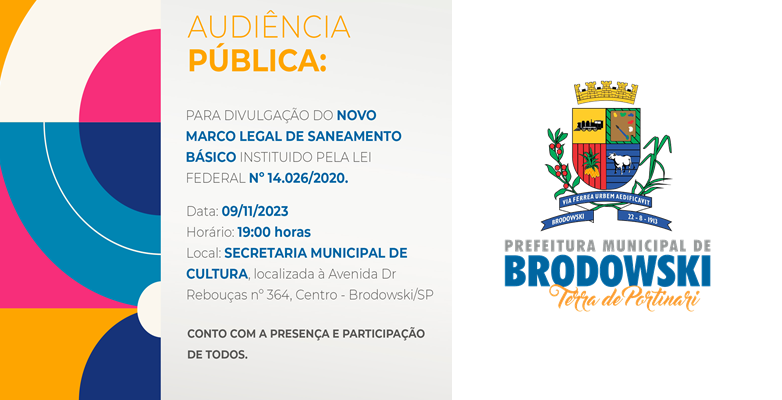 A PREFEITURA DO MUNICIPIO DE BRODOWSKI/SP divulga para conhecimento público, que, em 09 de NOVEMBRO DE 2023, às 19h, na SECRETÁRIA MUNICIPAL DE CULTURA, localizada à Avenida Dr. Rebouças nº 364, Centro, nesta cidade de BRODOWSKI/SP realizar-se-á AUDIÊNCIA PÚBLICA para apresentação e divulgação do NOVO MARCO LEGAL DE SANEMANETO BÁSICO.