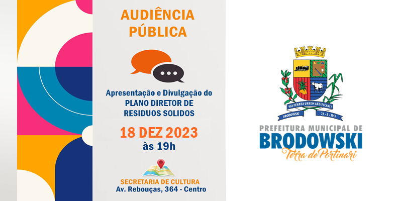 A PREFEITURA DO MUNICIPIO DE BRODOWSKI/SP divulga para conhecimento público, que, em 18 de DEZEMBRO DE 2023, às 19h, na SECRETARIA MUNICIPAL DE CULTURA, localizada à Avenida Dr. Rebouças nº 364, Centro, nesta cidade de BRODOWSKI/SP realizar-se-á AUDIÊNCIA PÚBLICA para apresentação e divulgação do PLANO DIRETOR DE RESIDUOS SOLIDOS. O MUNICÍPIO DE BRODOWSKI, divulga, ainda, que, a minuta do PLANO está disponibilizada para CONSULTA PÚBLICA, no site www.brodowski.sp.gov.br.