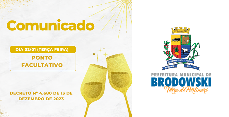 A Prefeitura do Município de Interesse Turístico de Brodowski informa que no dia 02 de Janeiro de 2024, NÃO haverá expediente nas repartições públicas do Município devido ao Ponto Facultativo (DECRETO Nº 4.680 DE 13 DE DEZEMBRO DE 2023).