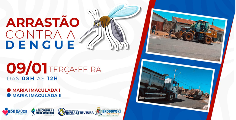 Atenção, moradores dos Bairros Maria Imaculada I e II! No dia 09/01, terça-feira das 8h às 12h, teremos um arrastão contra a dengue em seu bairro. Colabore com a saúde de todos! Selecione e deixe na calçada materiais inservíveis e aqueles que acumulam água parada. Profissionais da Secretaria Municipal de Saúde, Infraestrutura e Meio ambiente estarão trabalhando juntos para recolher esses itens. Vamos eliminar os criadouros do mosquito da dengue! Contamos com sua colaboração para tornar Maria Imaculada mais segura e saudável. O perigo pode estar em casa! E a solução também!