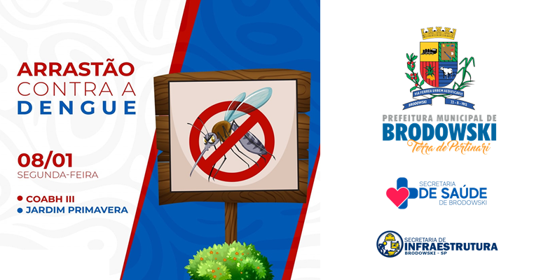 Prezados moradores do COABH III e Jardim Primavera, No dia 08/01, segunda-feira, das 8h às 12h, teremos um arrastão contra a dengue nestes bairros. Colabore com a saúde de todos! Selecione e deixe na calçada materiais inservíveis e aqueles que acumulam água parada. Profissionais da Secretaria Municipal de Saúde e Infraestrutura estarão trabalhando juntos para recolher esses itens. Vamos eliminar os criadouros do mosquito da dengue! O perigo pode estar em casa! E a solução também!
