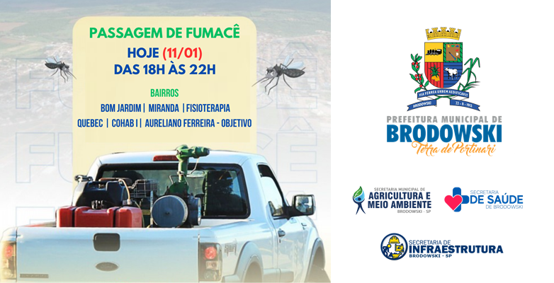 Atenção moradores dos bairros BOM JARDIM, MIRANDA, FISIOTERAPIA, QUEBEC, COHAB I e AURELIANO FERREIRA – OBJETIVO. No dia de HOJE 11/01, quinta-feira, das 18h às 22h, teremos a passagem de FUMACÊ contra a dengue nestes bairros. Vamos eliminar os criadouros do mosquito da dengue! O perigo pode estar em casa! E a solução também! Não deixe acumular água parada.
