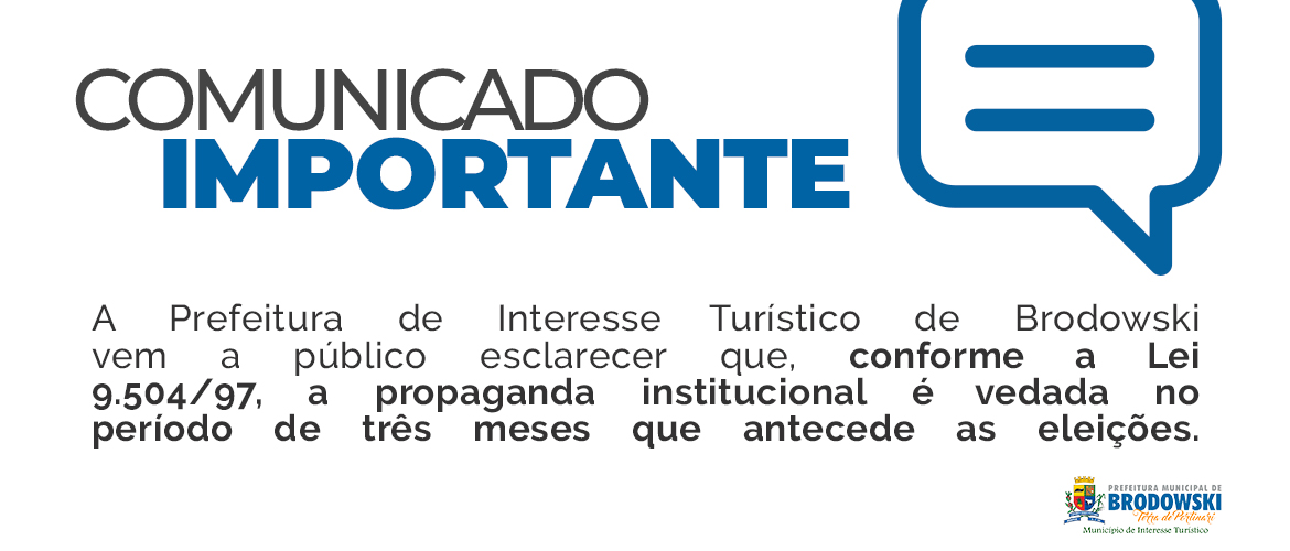 A Prefeitura de Interesse Turístico de Brodowski vem a público esclarecer que, conforme a Lei 9.504/97, a propaganda institucional é vedada no período de três meses que antecede as eleições.
