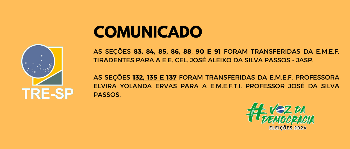 AS SEÇÕES 132, 135 E 137 FORAM TRANSFERIDAS DA E.M.E.F. PROFESSORA ELVIRA YOLANDA ERVAS PARA A E.M.E.F.T.I. PROFESSOR JOSÉ DA SILVA PASSOS.