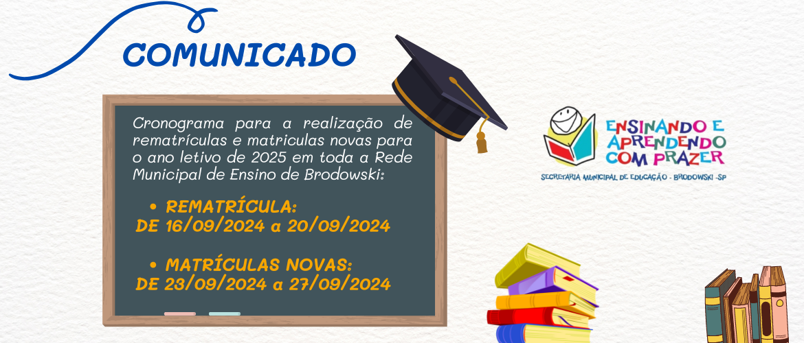 Cronograma para a realização de rematrículas e matriculas novas para o ano letivo de 2025 em toda a Rede Municipal de Ensino de Brodowski: