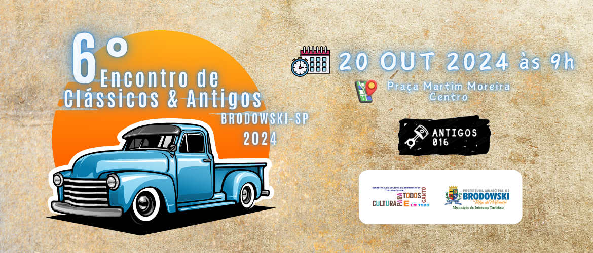 A Prefeitura Municipal de Interesse Turístico de Brodowski-SP, através da Secretaria Municipal de Cultura em parceria com os “ANTIGOS 16” convidam toda a população brodowskiana para o 6º Encontro de Clássicos e Antigos de Brodowski. Um dos melhores eventos do segmento no estado de São Paulo, atraindo os apaixonados por carros antigos de todo o estado e sul de Minas.